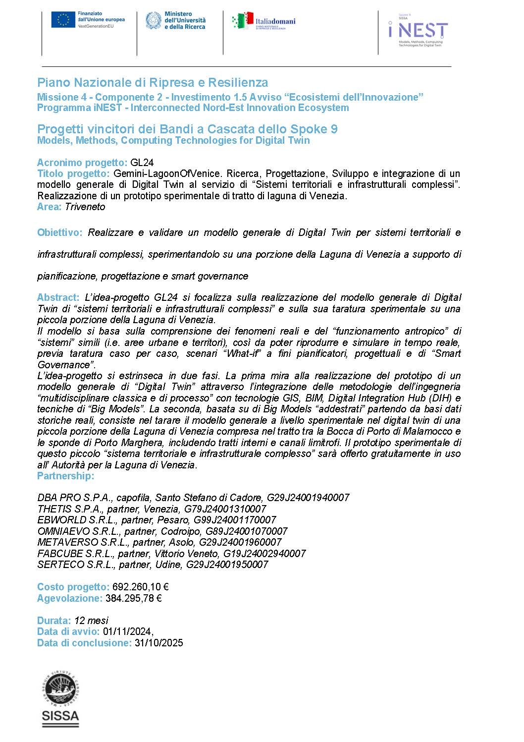 The project “GEMINI - Lagoon of Venice: Research, Design, Development, and Integration of a General Digital Twin Model for ‘Complex Territorial and Infrastructural Systems.’ Creation of an Experimental Prototype for a Section of the Venice Lagoon” – acronym GL24 (CUP: G29J24001940007) – is funded within the research program of the innovation ecosystem “iNEST – Interconnected Nord-Est Innovation Ecosystem,” Spoke 9 entitled “Models, Methods, Computing Technologies for Digital Twin” (CUP UNITS G93C22000610007), under the resources of the PNRR, M4C2 – Funded by the European Union, NextGenerationEU – Project ID 32DED192AB.