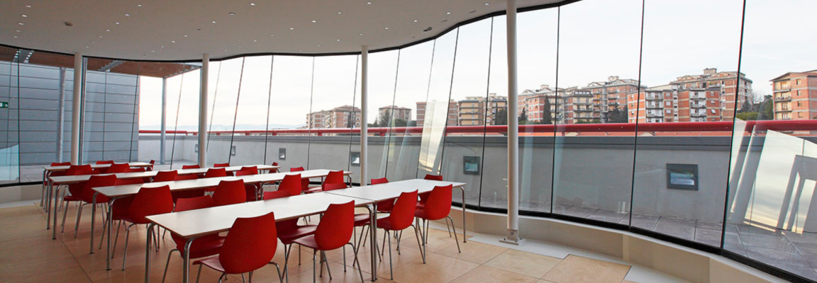 The main theme of the project is the relationship between the new architecture and the historic city, at the edge of which the building stands on three above-ground levels based on a double slab: the lower level is dedicated to vehicle parking and several ancillary spaces; the upper level is devoted to research and laboratory activities, an auditorium for 200 people and large areas of the technology centre.