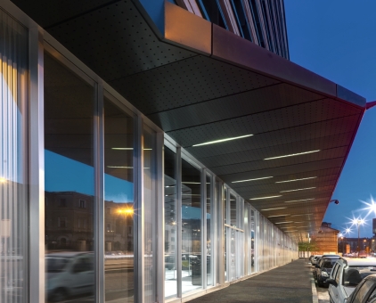 The reshaping of the ribbon facades introduces vertical glass blades in the orthogonal direction to the windows that, together with the particular design of the window sills and interior vats, help to increase the natural light input in the work spaces.
