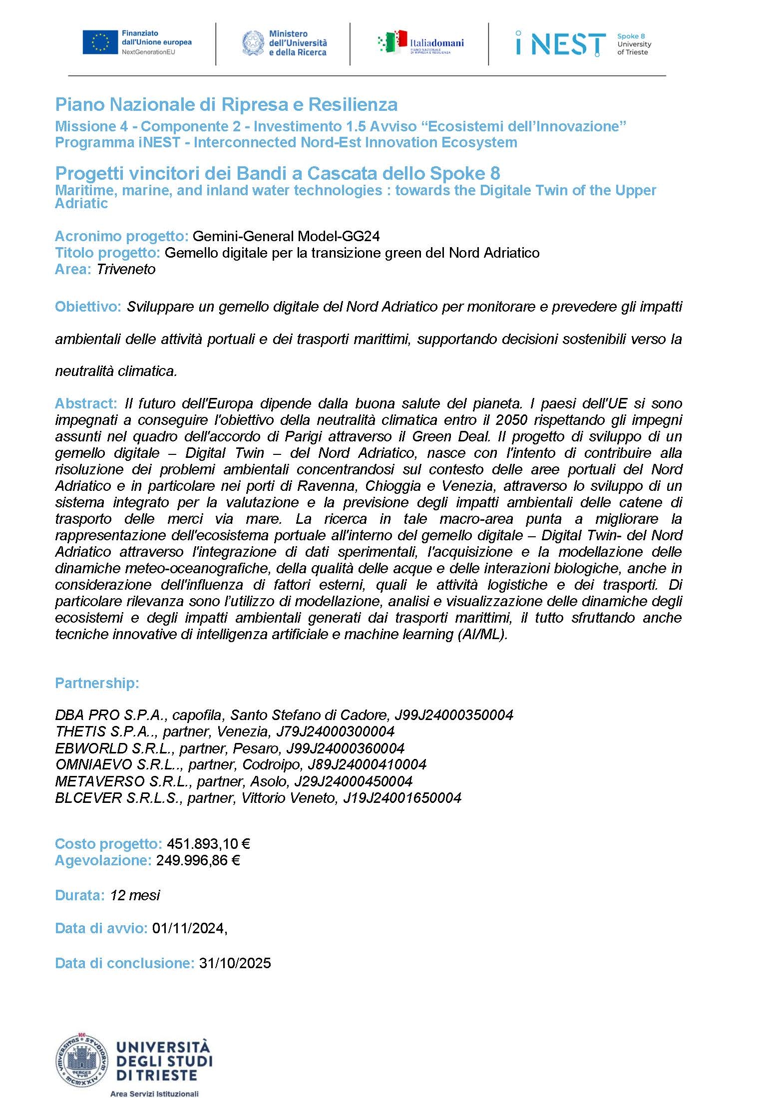 Il progetto GEMINI - General Model - GG24 (CUP: J99J24000350004) è finanziato nell’ambito del programma di ricerca dell’ecosistema dell’innovazione “iNEST – Interconnected Nord-Est Innovation Ecosystem”, Spoke 8 intitolato “Maritime, Marine, and Inland Water Technologies: Towards the Digital Twin of the Upper Adriatic” (CUP UNITS J43C22000320006), a valere sulle risorse del PNRR, M4C2 – Finanziato dall’Unione Europea, NextGenerationEU – Progetto ID 32DED09C9C.