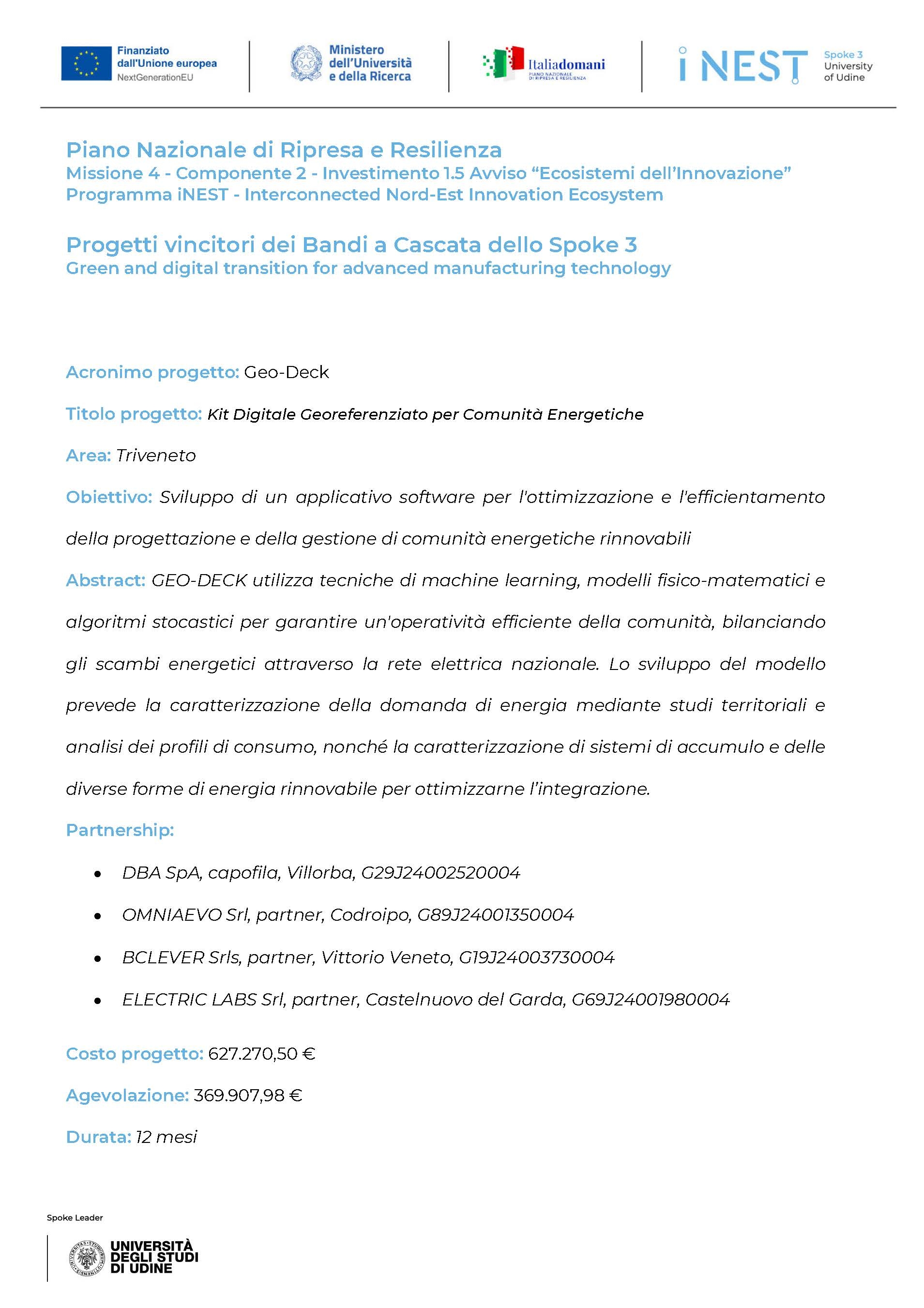 Il progetto Geo-Deck (CUP: G29J24002520004) è finanziato nell’ambito del programma di ricerca dello Spoke 3 di iNEST «Interconnected Nord-Est Innovation Ecosystem» (CUP: G23C22001130006), a valere sulle risorse del Piano Nazionale per la Ripresa e Resilienza (PNRR), M4C2, inv. 1.5. creazione e rafforzamento di "Ecosistemi dell’innovazione per la sostenibilità”, finanziato dall’Unione Europea, NextGenerationEU – RT1.3. Energia.